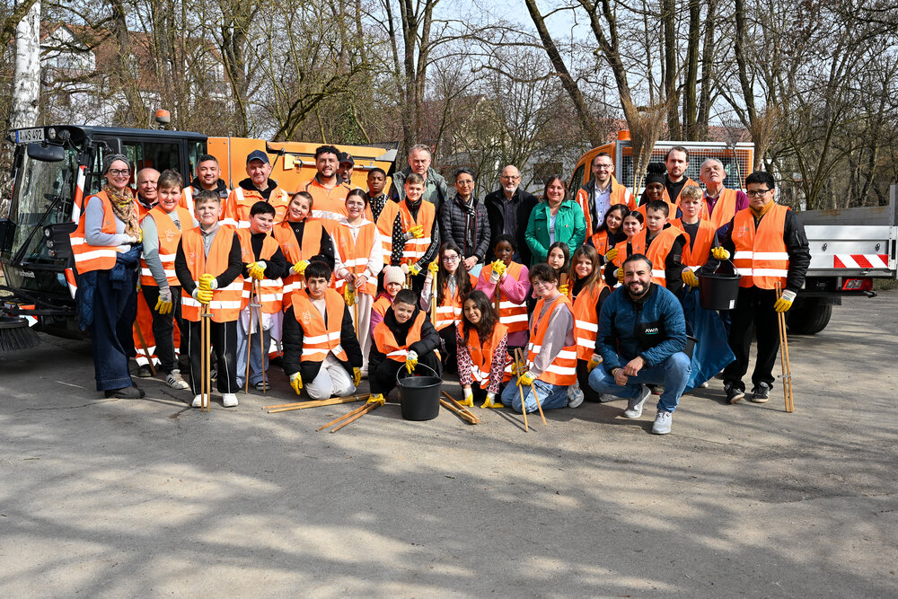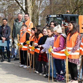 An der gemeinsamen Reinigungsaktion nahmen Schulkinder der vierten und sechsten Jahrgangsstufe sowie zweite Bürgermeisterin Martina Wild, Umweltreferent Reiner Erben und der Werkleiter des AWS, Christian Brockmann, teil. Nach getaner Arbeit lud der AWS zu einer Brotzeit „to go“ ein.