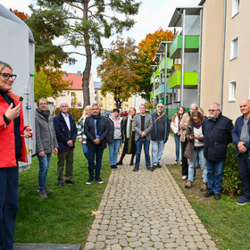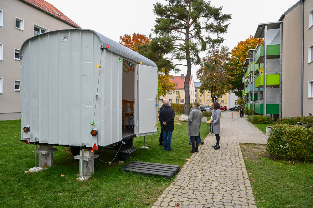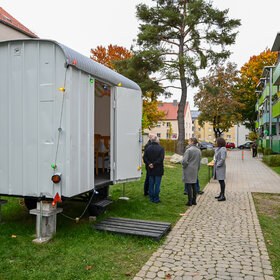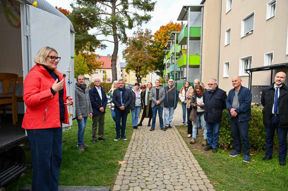 Im Drosselweg im Stadtteil Bärenkeller steht einer der beiden städtischen Bauwagen, der jetzt eröffnet wurde. v.l. OB Eva Weber, Julia Hüther (AfWuW), Rupert Hackl (von-Tessin-Stiftung), Fritz Stütz (Kinderchancen e.V.), Sozialreferent Martin Schenkelberg. Eingerahmt von zwei Studentinnen der IU Internationalen Hochschule. Foto: Ruth Plössel/Stadt Augsburg.