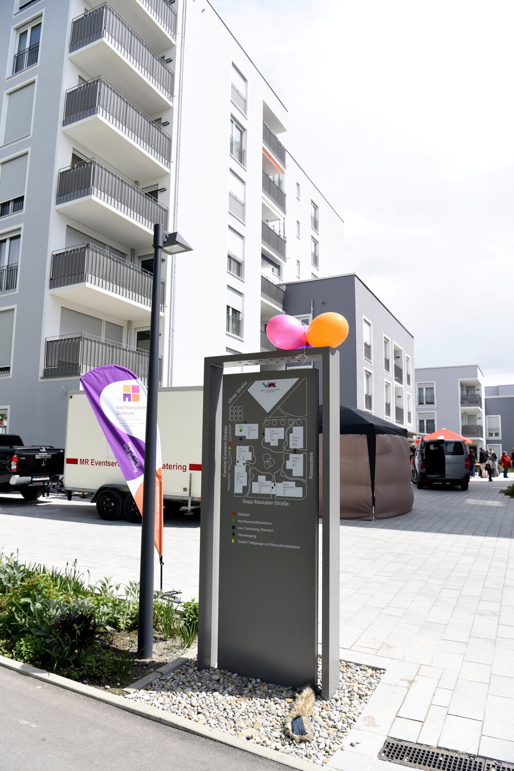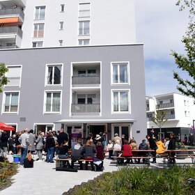 Gemeinsam mit Sozialreferent Martin Schenkelberg, den Projektbeteiligten, Vertreterinnen und Vertretern der Wohnbaugruppe Augsburg (WBG), der Pfarrei St. Thaddäus, der Diözese, der Stadtteil-Vereine und -Initiativen sowie zahlreichen interessierten Bürgerinnen und Bürgern hat die Oberbürgermeisterin das neue Nachbarschafts-Zentrum (NBZ) Kriegshaber am vergangenen Freitag, 26. Juni, eröffnet. Im Anschluss an die offizielle Feier wurde das Gebäude gesegnet. Anschließend lud das NBZ Kriegshaber zu einem bunten Nachmittag mit Hausführungen und Aktionen für Familien. Für musikalische Unterhaltung sorgten die „Rollin‘ Coneheads“.