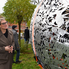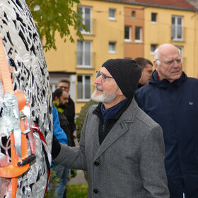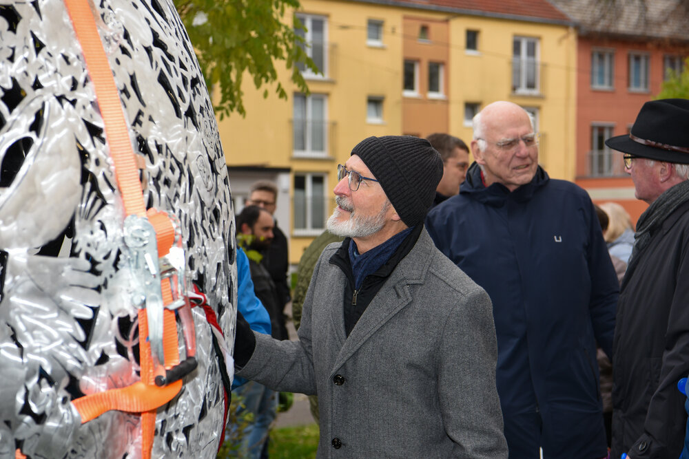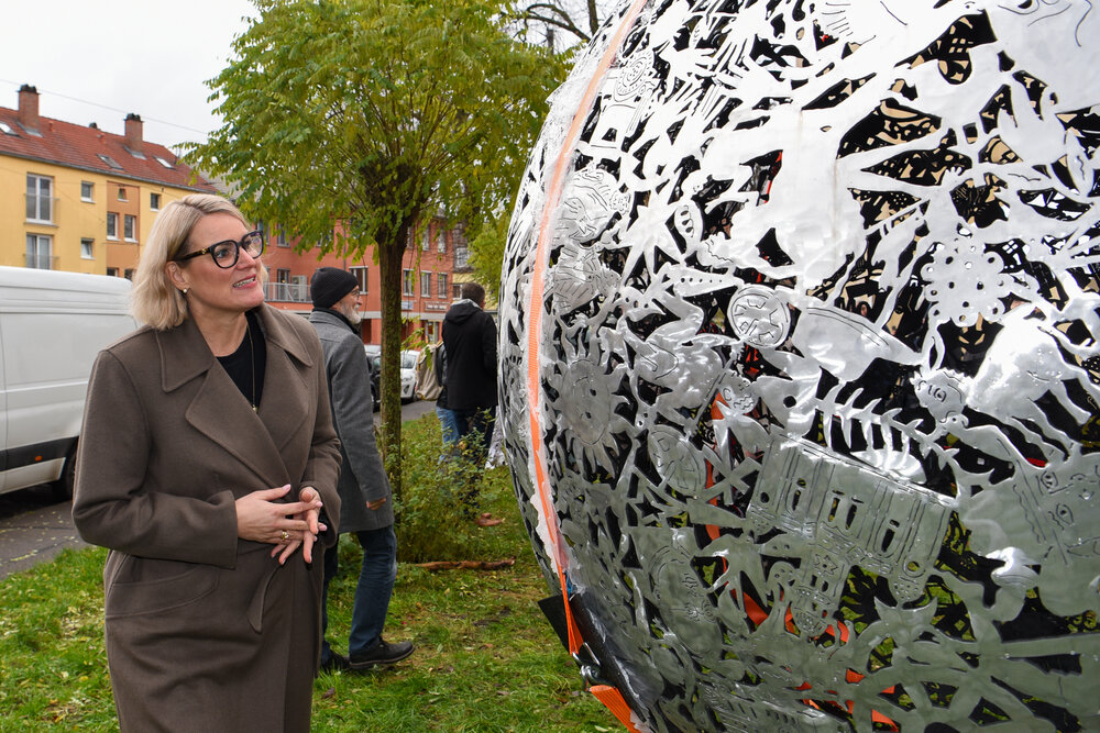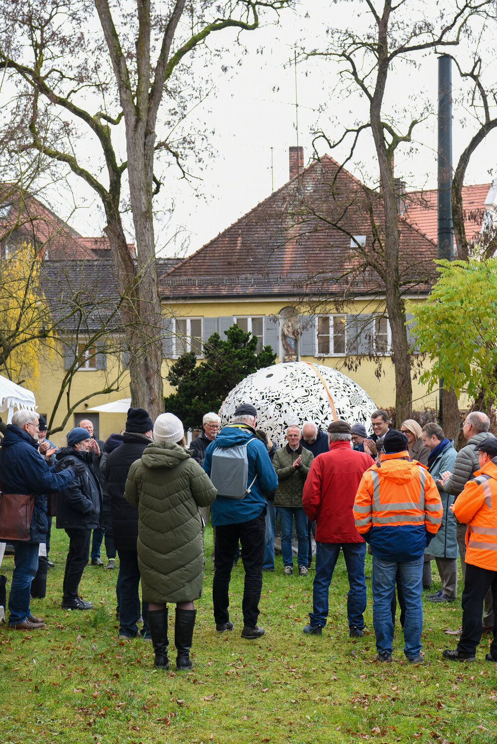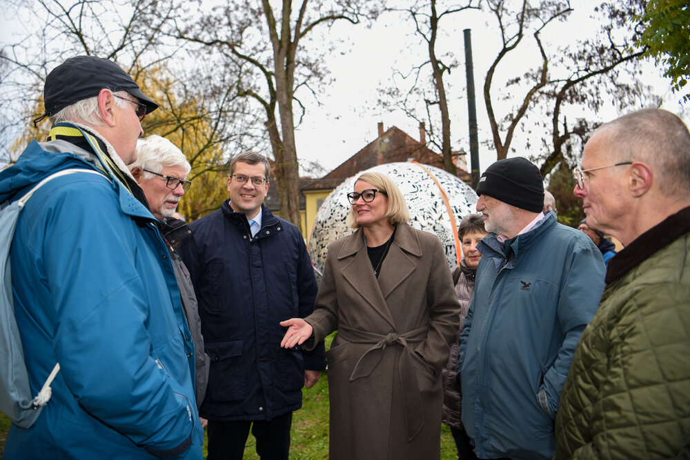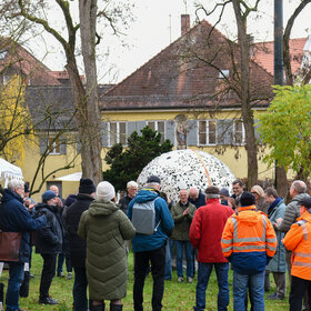 So weit die aktuellen Pläne. Oberbürgermeisterin Eva Weber und Baureferent Steffen Kercher haben sie in dieser Woche vorgestellt. Direkt vor Ort. Die Bürgerinnen und Bürger aus Pfersee kamen zahlreich und zeigten großes Interesse. Mit dabei war auch die „Erzählkugel“, eine Skulptur, die dem Platz sein ganz eigenes Flair geben wird.