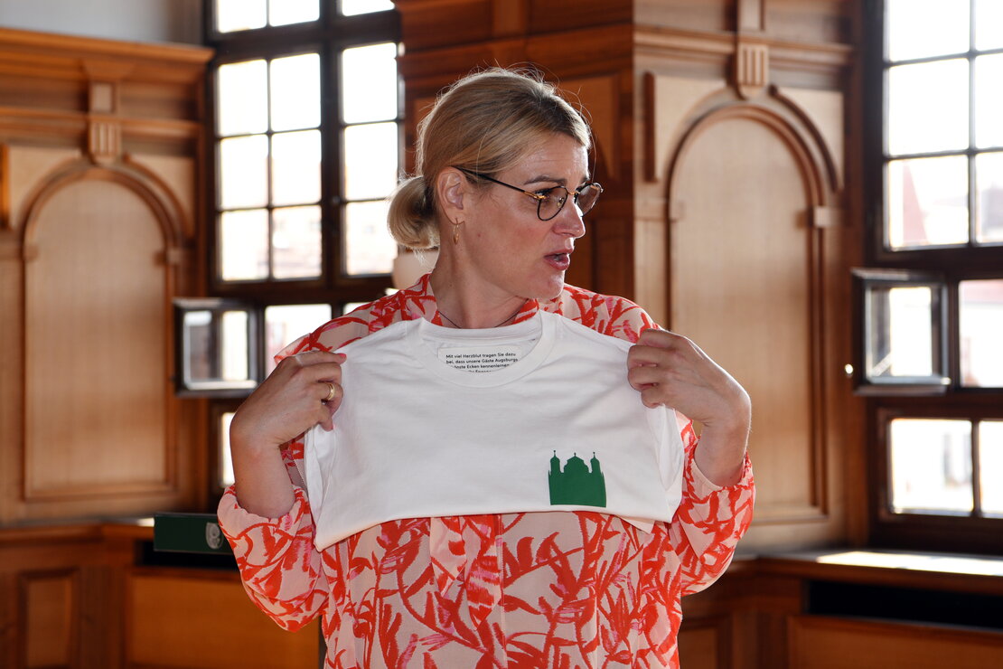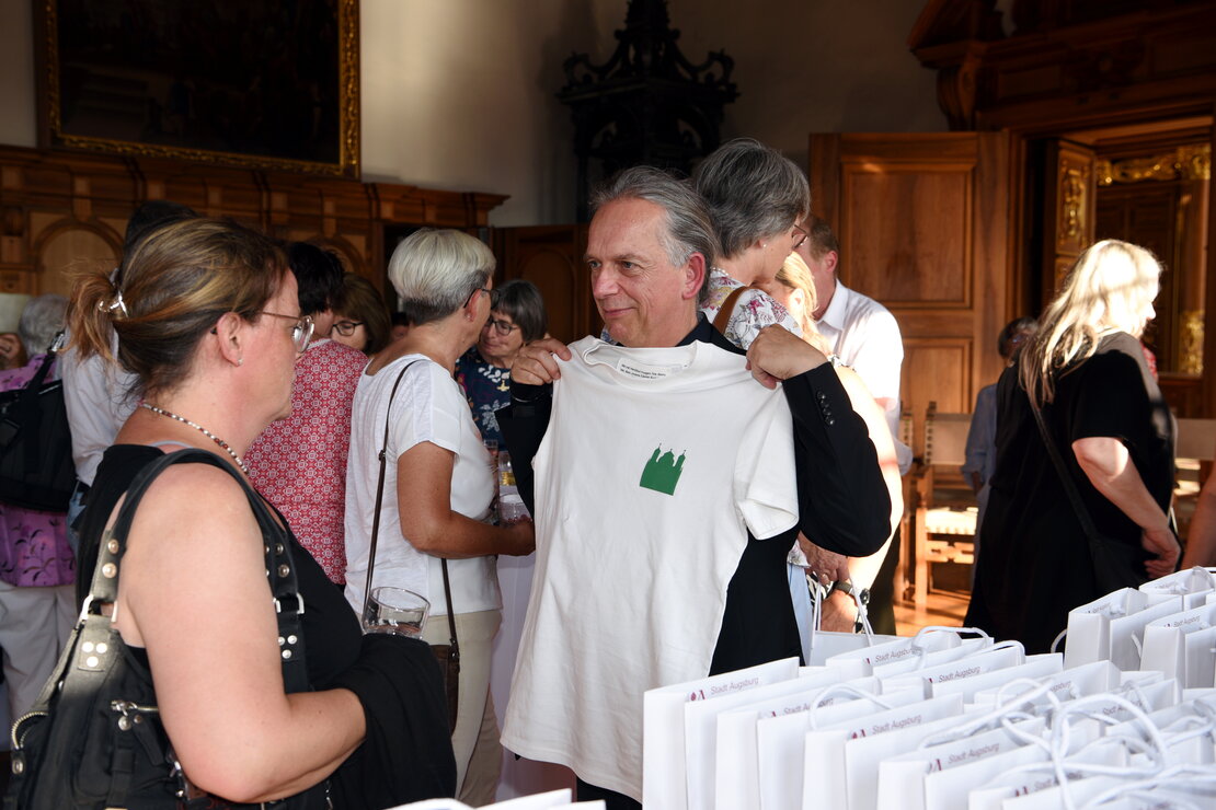 „Mit viel Herzblut tragen Sie dazu bei, dass unsere Gäste Augsburgs schönste Ecken kennenlernen. Danke für Ihr Engagement!“ – mit diesen Worten dankte Oberbürgermeisterin Eva Weber den Stadtführerinnen und Stadtführern der Regio Augsburg Tourismus GmbH. Aber nicht nur in ihrer Begrüßungsrede. Denn dieser Dankesgruß ist eingestickt in ein T-Shirt, das die Geehrten geschenkt bekamen. Gestaltet wurde es vom Grafik-Team der Stadt Augsburg und hat auf der Vorderseite wahlweise Augustus, Herkules, Merkur oder das Rathaus als Signet aufgedruckt. Dazu gab es ein Postkarten-Set mit aufwendig gestalteten Augsburg-Motiven für ganz besondere „Grüße aus Augsburg“. (ps/rs)