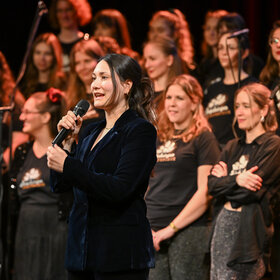 Jasmin Nimar moderierte die Darbietungen des Kneipenchors. Foto: Ruth Plössel/Stadt Augsburg