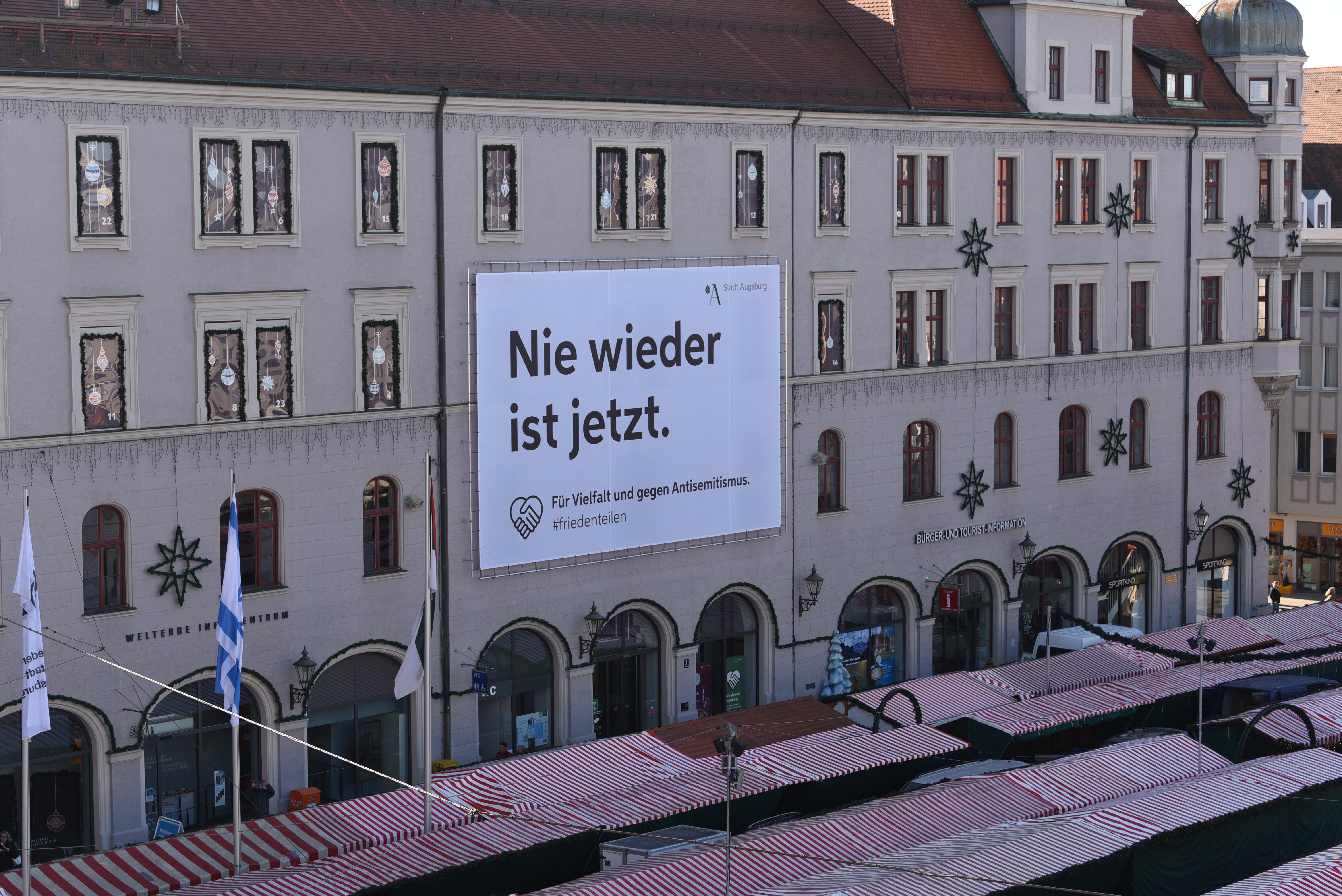 Als deutlich sichtbares Zeichen der Stadt Augsburg gegen Antisemitismus hängt seit heute (23. November) ein großes Banner mit der Aufschrift „Nie wieder ist jetzt. Für Vielfalt und gegen Antisemitismus.“ am Verwaltungsgebäude am Rathausplatz. Die Entscheidung für das Banner in dieser Form und Gestaltung wurde vor dem Hintergrund des erstarkenden Antisemitismus in der Gesellschaft gemeinsam mit dem Ältestenrat der Stadt Augsburg und der Israelitischen Kultusgemeinde Schwaben-Augsburg getroffen. Bereits vergangenen Montag wurden am Rathausplatz zwei Friedenflaggen sowie eine Flagge mit der Botschaft „Wir alle sind Augsburg“ gehisst. Nationalflaggen werden am Rathausplatz weiterhin anlassbezogen zum Einsatz kommen.
