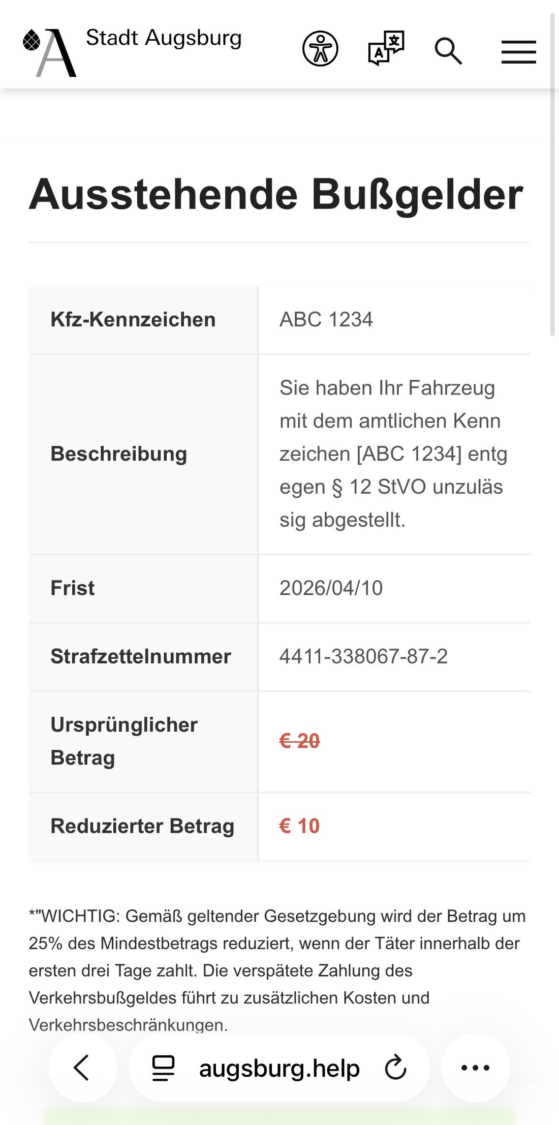 Beim Eingeben des beigefügten Links wird man auf eine Webseite geführt, die der der Stadt Augsburg täuschend ähnlich sieht. Dort werden Daten abgefischt, unter anderem das Verkehrszeichen und Zahlungsdetails.