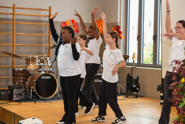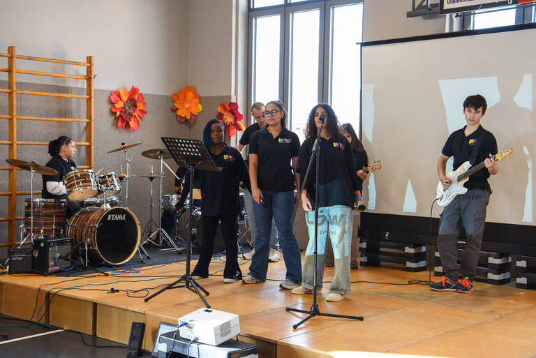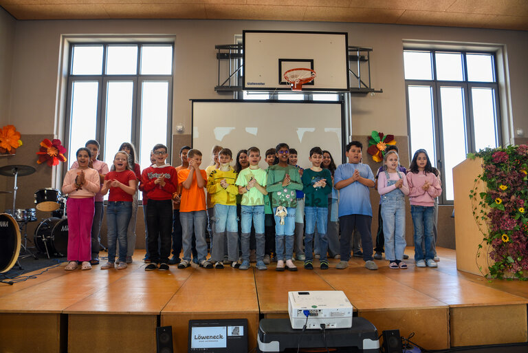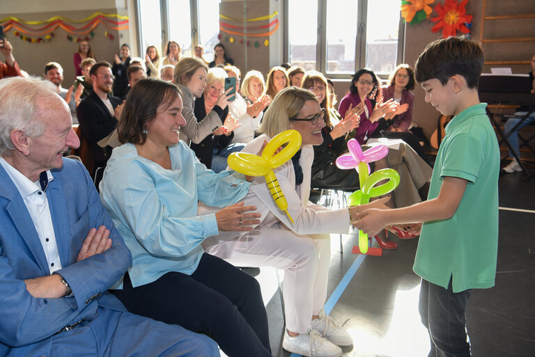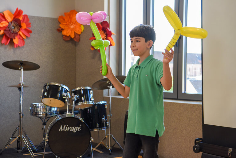 Die Schülerinnen und Schüler setzten mit Tanz, Schulband, Duett und einer Ballonkunst-Zirkusnummer einen besonderen Rahmen der Veranstaltung. Die Architekten Roman Adrianowytsch und Alen Jasarevic gaben zudem eine Einführung in die geleisteten Arbeiten. Besonderer Höhepunkt und Anlass zu großer Freude war die Übergabe eines Gutscheins für eine Wippe, die die WBG noch auf dem Gelände realisieren und so die Aufenthaltsqualität auf dem Pausenhof noch weiter steigern wird.
