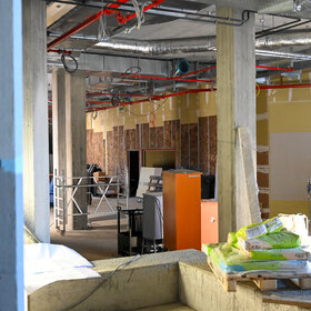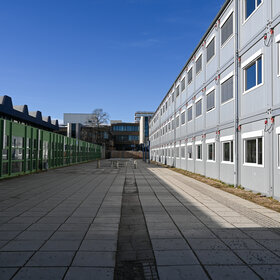 Um den Schulbetrieb auch während der Zeit der Baumaßnahmen zu gewährleisten, wurde 2022 eine Interimsschule mit Containern errichtet. 48 Klassenzimmer, Fachräume, Aufenthaltsbereiche, sowie Büros und sanitäre Einrichtungen wurden aufgebaut. Mit Beginn des Schuljahres 2022/2023 ist die RWS in die Ersatzklassenzimmer eingezogen. Im nächsten Schritt wurde der Bauabschnitt der freigeräumten RWS für die Sanierung vorbereitet und vom Rest des Schulbaukörpers mit einer Pufferzone abgetrennt, sodass die Arbeiten beginnen konnten.