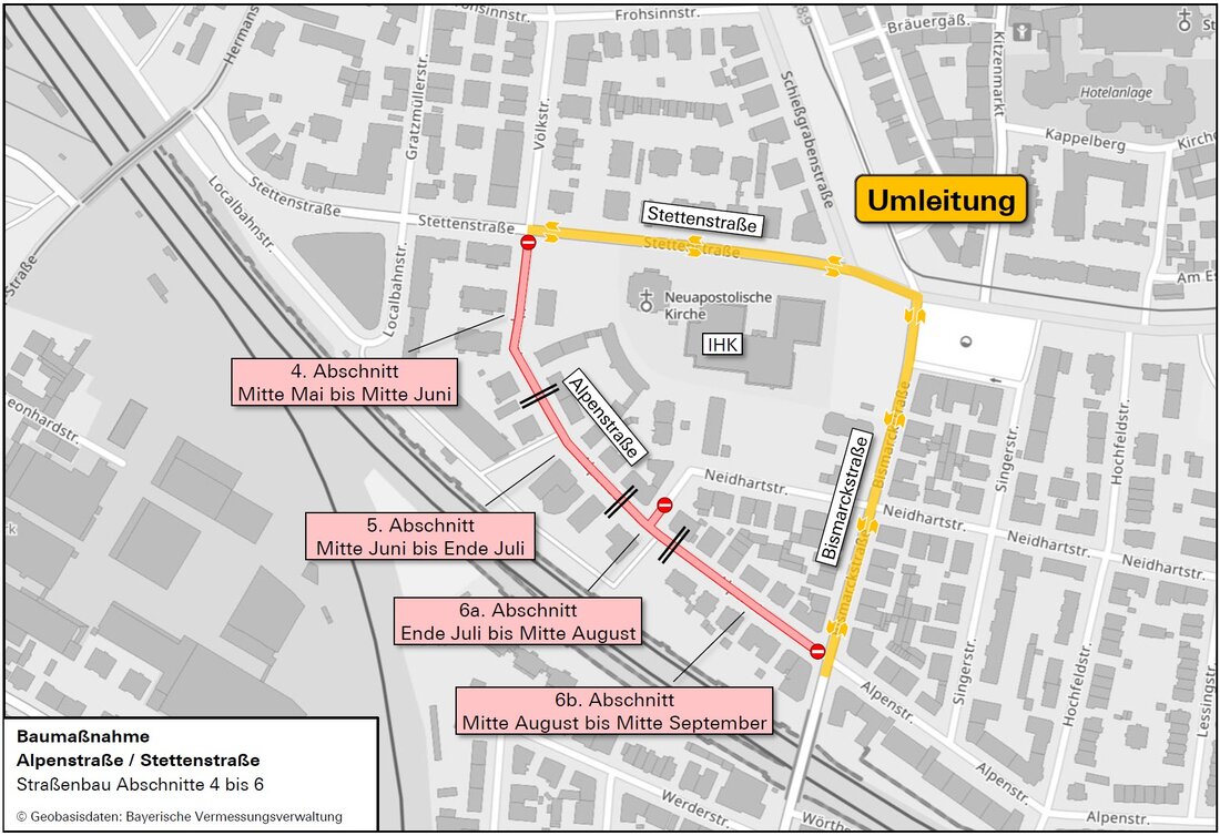 In dieser Bauphase kommt es abschnittweise zur Vollsperrung der Alpenstraße zw. Stettenstraße und Bismarckstraße (vgl. Karte) in beide Richtungen inklusive einer Gehwegseite (wechselweise). Der verbleibende Gehweg dient dem fußläufigen Zugang zu den Grundstücken. Die Zufahrt zu den Grundstücken ist nur eingeschränkt nach Absprache möglich. Eine Umleitung erfolgt über die Stettenstraße, Theodor-Heuss-Platz und Bismarckstraße in beiden Richtungen eingerichtet. Genaue Details über den Baufortschritt können den Karten entnommen werden: Siehe Karten.