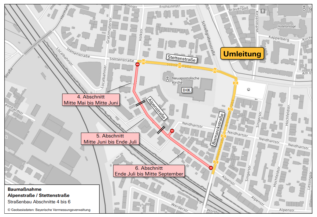 Die Stettenstraße wird zwischen der Localbahnstraße und Hausnummer 16 zur Einbahnstraße Richtung Gögginger Brücke / Hermanstraße. Eine Umleitung wird in dieser Zeit über die Ladehofstraße, Halderstraße und Schießgrabenstraße eingerichtet.