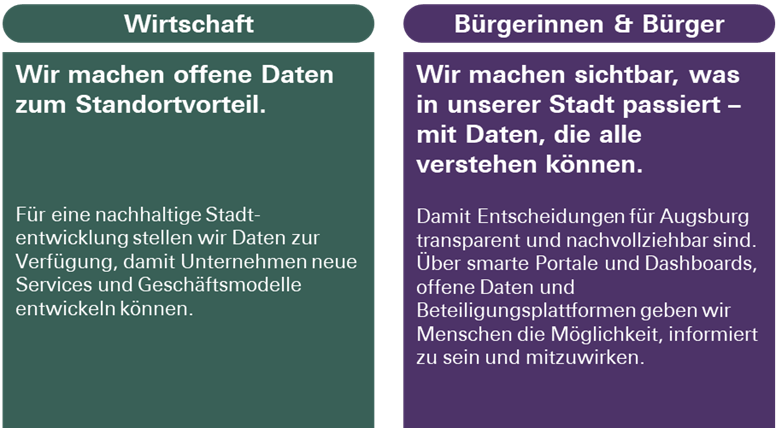 Augsburg soll eine lebenswerte, sichere und zukunftsorientierte Stadt sein. Die digitale Möglichkeiten sollen gezielt genutzt werden, um das Leben der Bürgerinnen und Bürger zu verbessern. Durch nachhaltige Stadtentwicklung und Digitalisierung werden Ressourcen geschont, Prozesse transparenter, Wege kürzer und Angebote leichter zugänglich.