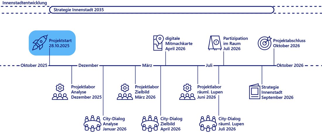 In Phase 2 wird ab April 2026 der Prozess weiter geöffnet und die Bevölkerung über eine digitale Mitmachkarte und Interaktionen im öffentlichen Raum systematisch einbezogen. Hier werden strategische Ziele der Innenstadtentwicklung, aber auch Chancen und Lösungsansätze in Teilräumen der Innenstadt (Lupenbereiche) diskutiert und erarbeitet. Im Zusammenspiel mit den lokalen Stakeholdern werden die Eckpunkte der Strategie Innenstadt 2035 bis zum Sommer 2026 erarbeitet. Bis zum Herbst 2026 wird die Strategie Innenstadt 2035 als Broschüre für die politische Debatte bis zu einem konsensualen Leitbeschluss ausgearbeitet.