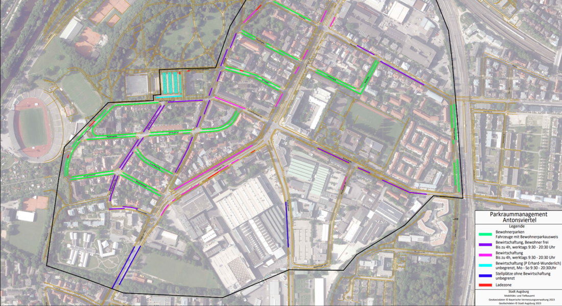 In Großstädten wie Augsburg ist das Parken eine der zentralen Herausforderungen städtischer Verkehrsplanung. Vor allem innenstadtnahe Gebiete wie das Antonsviertel weisen bei einer hohen Nutzungsdichte meist nur ein geringes Parkraumangebot im öffentlichen Raum auf. Eine wachsende Anzahl an Einwohnenden und zugelassenen Fahrzeugen sowie gesteigerte Anforderungen an den öffentlichen Raum verschärfen die Problematik. Die Folgen für diese Gebiete sind unter anderem eine eingeschränkte Erreichbarkeit, erhöhter Parksuchverkehr sowie eine Vielzahl an illegalen Parkvorgängen.