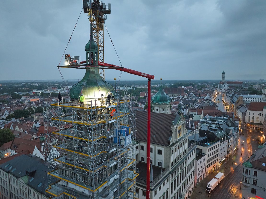 Der erste große Meilenstein der Sanierung wurde bereits im Juli 2025 mit der Abnahme der Turmzwiebel des Perlachturms erfolgreich abgeschlossen. Diese ruht derzeit vor dem Rathaus auf einem eigens errichteten Stahlgerüst, wo sie für die kommenden zwei Jahre das Herzstück des Info-Pavillons bildet. Dort können Bürgerinnen und Bürger sowie Gäste und Besuchende die Geschichte des Perlachs, die Sanierung und die Zukunft des Augsburger Wahrzeichens hautnah erleben. Für die Dauer der Sanierung besteht das Ziel, diese bis Herbst 2027 abzuschließen.
