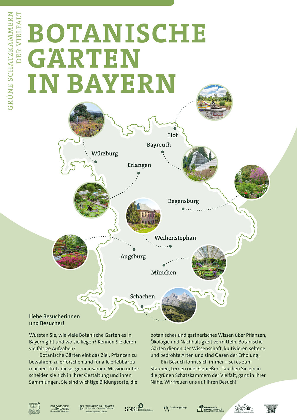 In ALLEN bayerischen Botanischen Gärten startet am Wochenende eine Poster-Ausstellung, in der sich die Botanischen Gärten mit ihren gemeinsamen Aufgaben und Zielen sowie ihren jeweiligen Besonderheiten und botanischen Schätzen vorstellen. Botanische Gärten stehen für botanisches und gärtnerisches Wissen, einzigartige Vielfalt und Schönheit, Freude und Erholung in der Welt der Pflanzen.