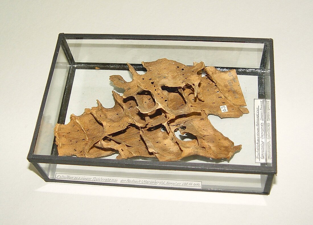 Dieses (Teil-) Nest der Braunschwarzen Ross-Ameise (Camponotus ligniperda) wurde einem 52 cm starken Fichtenstamm entnommen. Die Braunschwarze Ross-Ameise ist eine unserer größten heimischen Ameisenarten. Sie erreicht eine Körperlänge von bis zu 14 mm (Arbeiterinnen) bzw. 18 mm (Königinnen). Diese Ameisenart legt ihre Nester in Totholz an. Dabei werden die Bäume ausgenagt und der Baumstamm in bis zu drei Meter Höhe besiedelt. Auch in liegenden Bäumen werden Nester angelegt. Zum Nest gehört meist auch ein unterirdischer Teil.