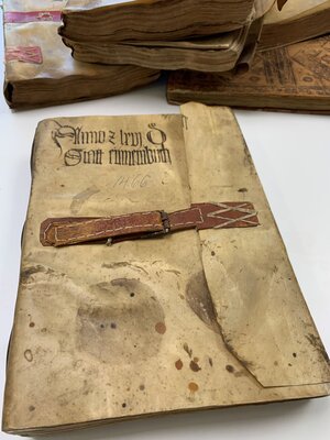Buchblock aus Hadernpapier, Koperteinband aus Pergament mit Schließe aus Leder und Metall, 31 cm h x 23 cm b