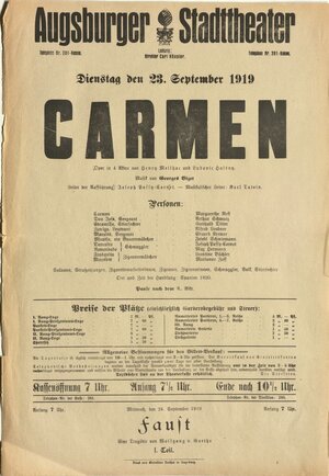 Stadtarchiv Augsburg, Theaterzettel und Besetzungszettel, Theaterzettel vom 23.09.1919