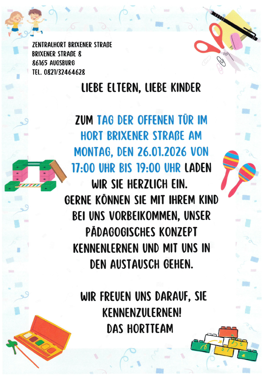 Der Tag der offenen Tür der städtischen Kita Zentralhort Brixener Straße findet am 26.01.2026 von 17.00 bis 19.00 Uhr statt. Wir laden Eltern mit Ihren Kindern ein! Einladung (PDF)